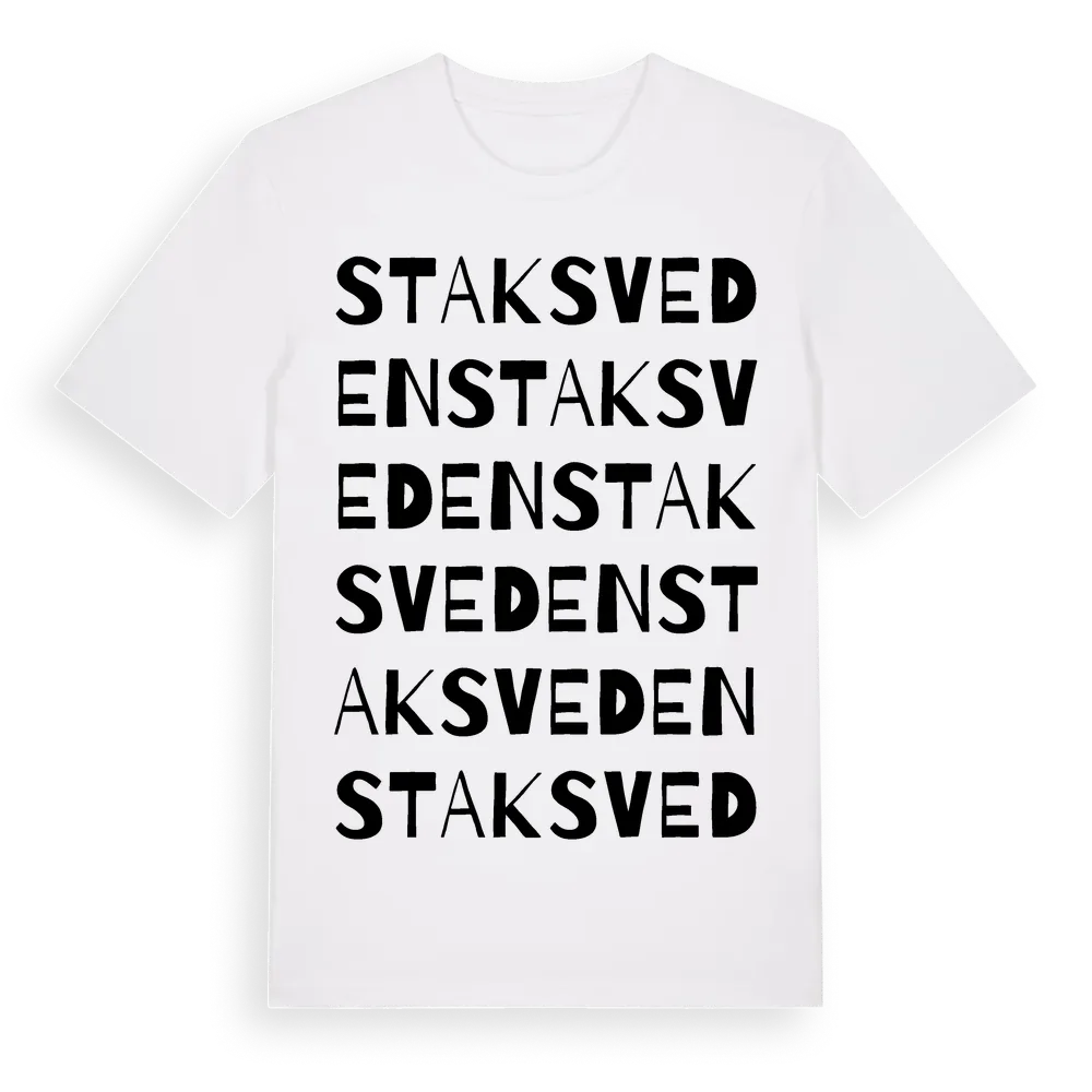Staksveden ordlek t-shirt är inspirerad av Staksveden i Dalarnas län, Sverige. Tröjan är designad för dig som har en speciell koppling till platsen – oavsett om du bor här, har rötterna här eller bara älskar Staksveden.