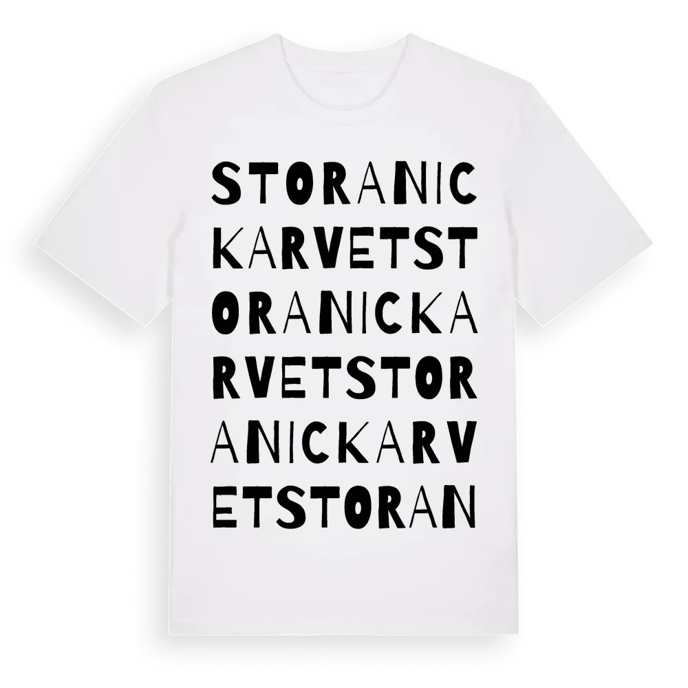 Stora Nickarvet ordlek t-shirt är inspirerad av byn Stora Nickarvet i Dalarnas län, Sverige. Tröjan är designad för dig som har en speciell koppling till platsen – oavsett om du bor här, har rötterna här eller bara älskar Stora Nickarvet.