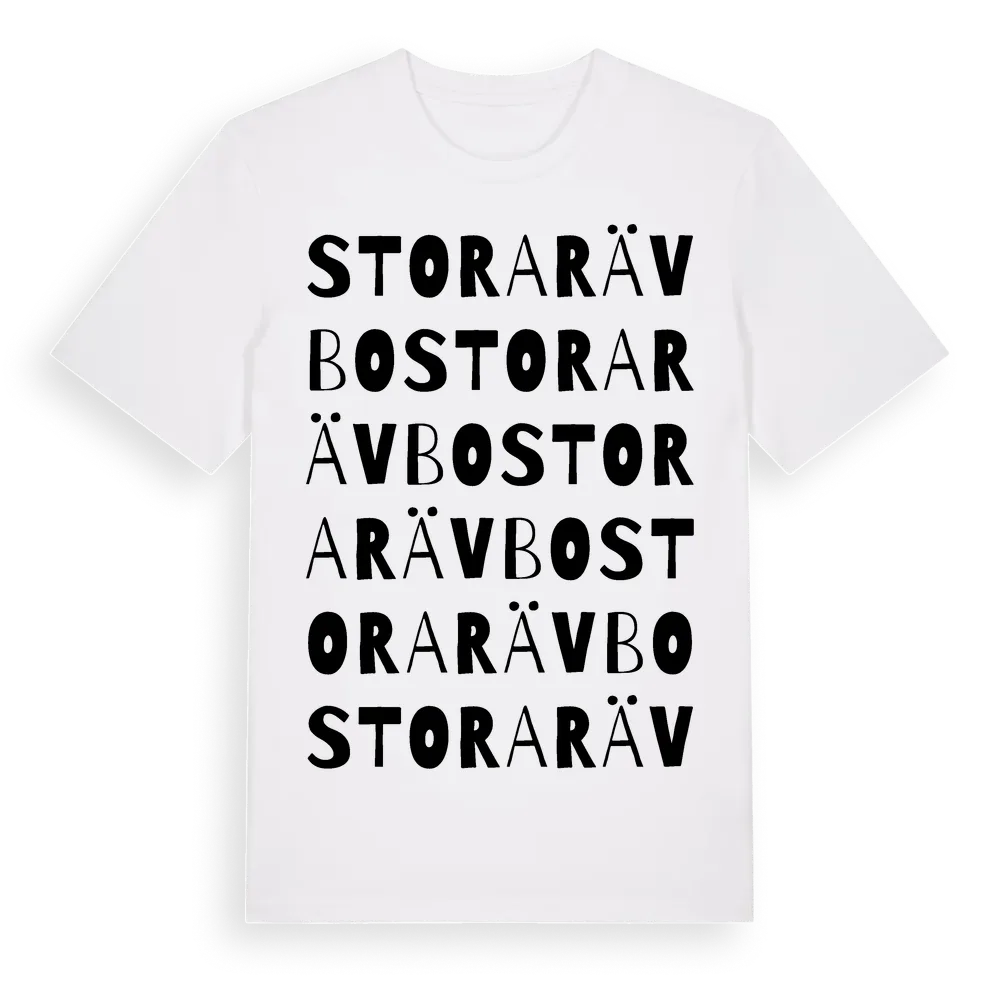 Stora Rävbo ordlek t-shirt är inspirerad av Stora Rävbo i Dalarnas län, Sverige. Tröjan är designad för dig som har en speciell koppling till platsen – oavsett om du bor här, har rötterna här eller bara älskar Stora Rävbo.