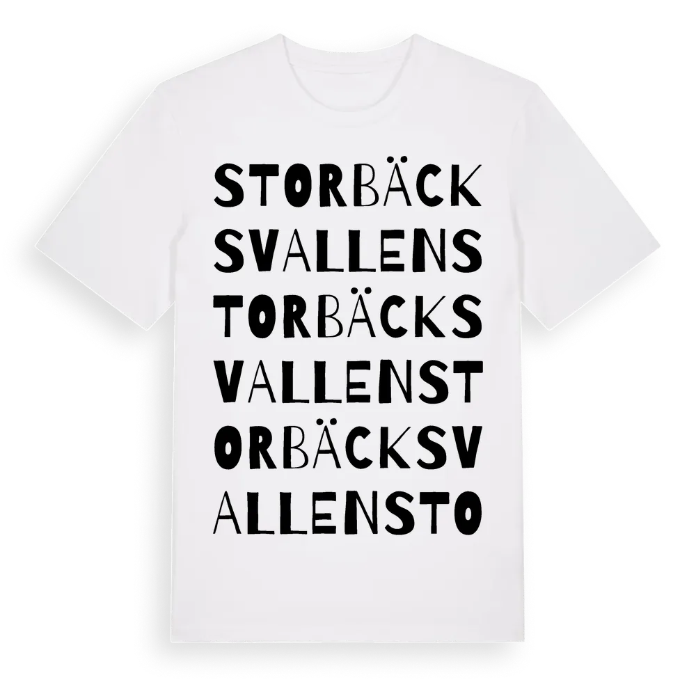 Storbäcksvallen ordlek t-shirt är inspirerad av byn Storbäcksvallen i Dalarnas län, Sverige. Tröjan är designad för dig som har en speciell koppling till platsen – oavsett om du bor här, har rötterna här eller bara älskar Storbäcksvallen.