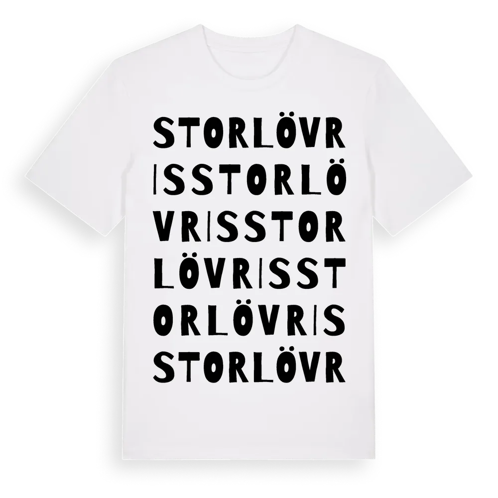 En ordlek byggd på Storlövriss namn. Subtilt och klurig – ett motiv som bara de som verkligen känner platsen fullt ut förstår. Premium bomull, unisex – från Storlövris i Dalarnas län.