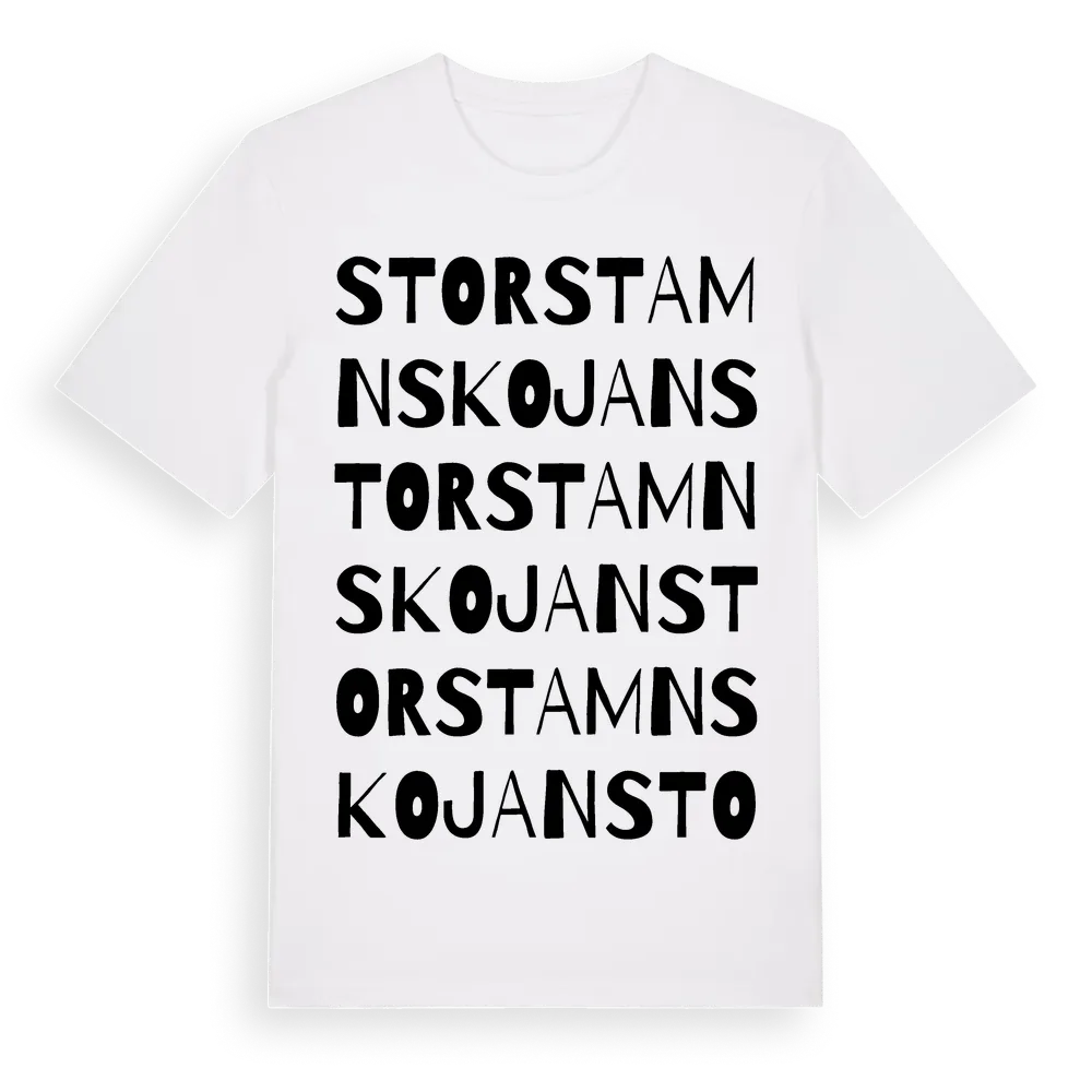 Storstamnskojan ordlek t-shirt är inspirerad av Storstamnskojan i Dalarnas län, Sverige. Tröjan är designad för dig som har en speciell koppling till platsen – oavsett om du bor här, har rötterna här eller bara älskar Storstamnskojan.