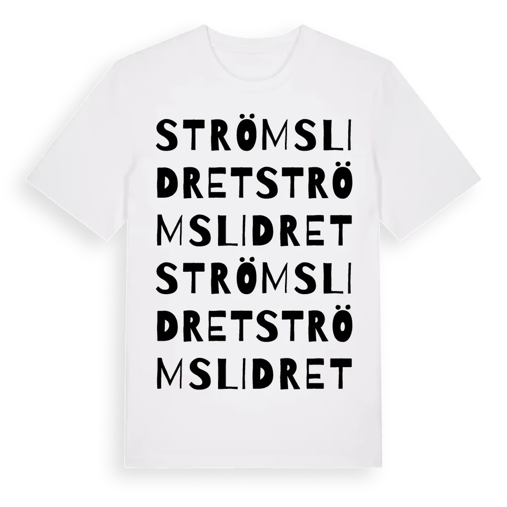 Strömslidret ordlek t-shirt är inspirerad av byn Strömslidret i Dalarnas län, Sverige. Tröjan är designad för dig som har en speciell koppling till platsen – oavsett om du bor här, har rötterna här eller bara älskar Strömslidret.