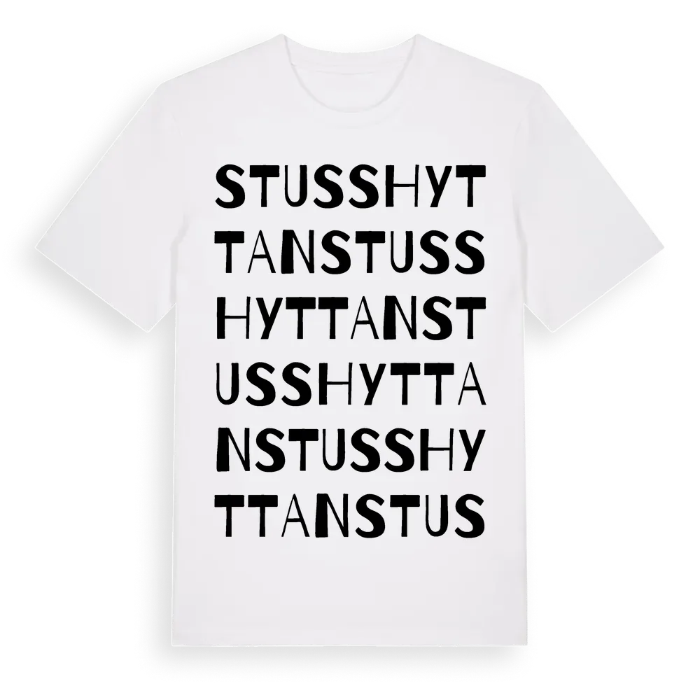 En ordlek byggd på Stusshyttans namn. Subtilt och klurig – ett motiv som bara de som verkligen känner platsen fullt ut förstår. Premium bomull, unisex – från byn Stusshyttan i Dalarnas län.