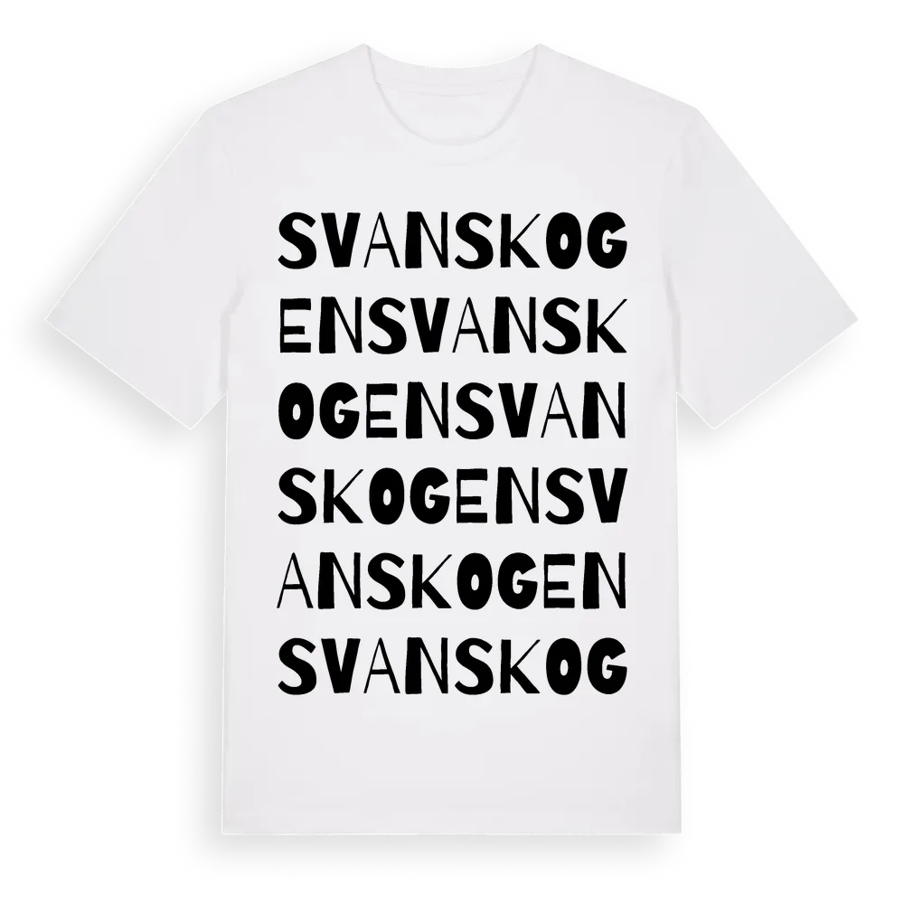 Svanskogen ordlek t-shirt är inspirerad av Svanskogen i Dalarnas län, Sverige. Tröjan är designad för dig som har en speciell koppling till platsen – oavsett om du bor här, har rötterna här eller bara älskar Svanskogen.