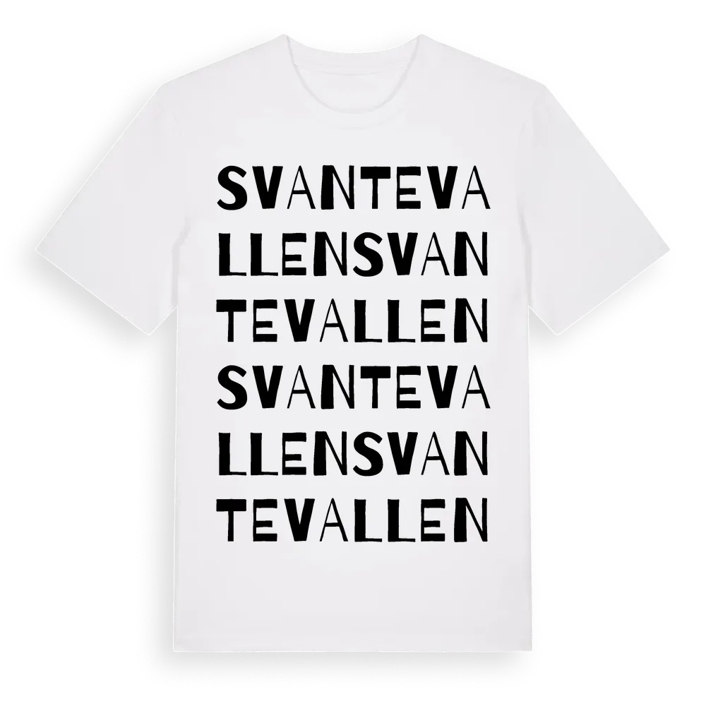 Svantevallen ordlek t-shirt är inspirerad av Svantevallen i Dalarnas län, Sverige. Tröjan är designad för dig som har en speciell koppling till platsen – oavsett om du bor här, har rötterna här eller bara älskar Svantevallen.