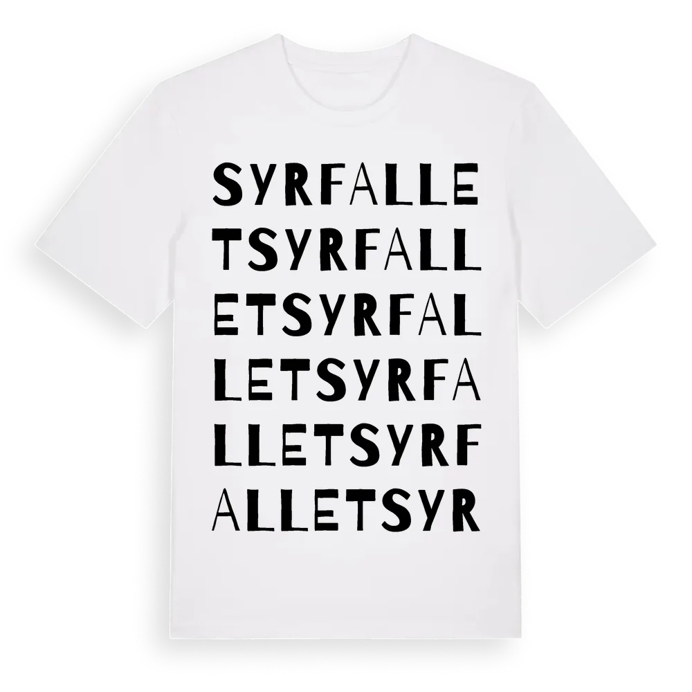 Syrfallet ordlek t-shirt är inspirerad av byn Syrfallet i Dalarnas län, Sverige. Tröjan är designad för dig som har en speciell koppling till platsen – oavsett om du bor här, har rötterna här eller bara älskar Syrfallet.
