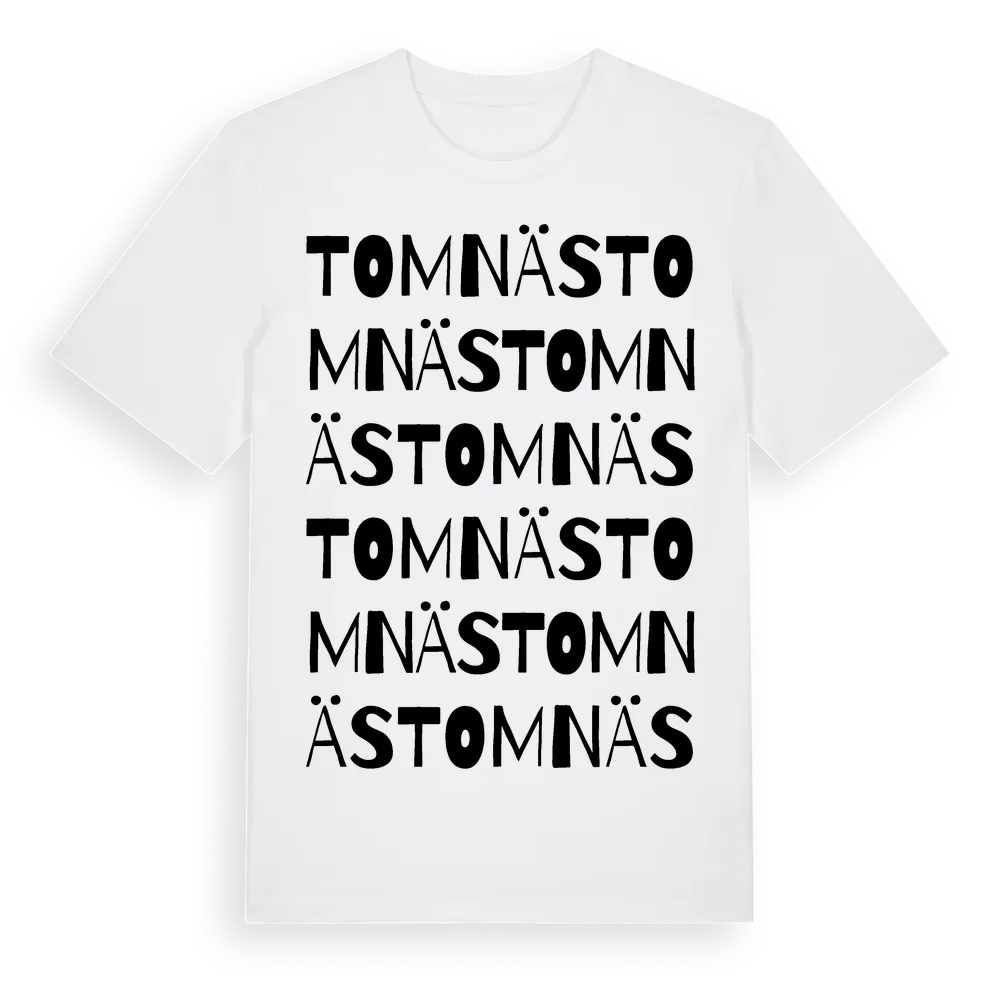 Tomnäs ordlek t-shirt är inspirerad av byn Tomnäs i Dalarnas län, Sverige. Tröjan är designad för dig som har en speciell koppling till platsen – oavsett om du bor här, har rötterna här eller bara älskar Tomnäs.