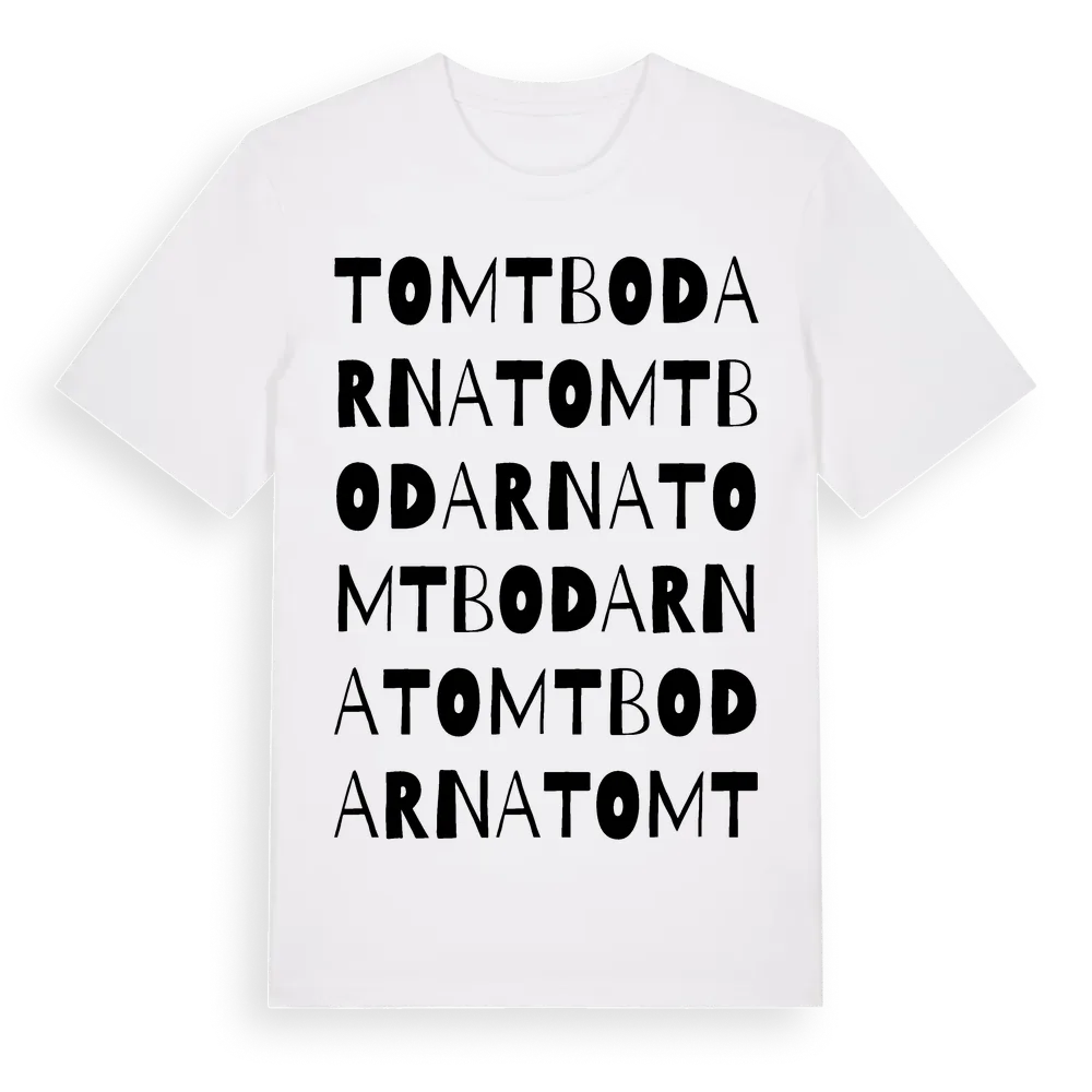 Tomtbodarna ordlek t-shirt är inspirerad av Tomtbodarna i Dalarnas län, Sverige. Tröjan är designad för dig som har en speciell koppling till platsen – oavsett om du bor här, har rötterna här eller bara älskar Tomtbodarna.