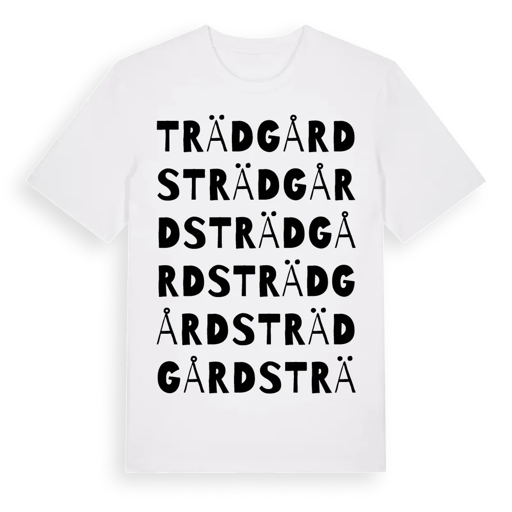 Trädgårds ordlek t-shirt är inspirerad av Trädgårds i Dalarnas län, Sverige. Tröjan är designad för dig som har en speciell koppling till platsen – oavsett om du bor här, har rötterna här eller bara älskar Trädgårds.
