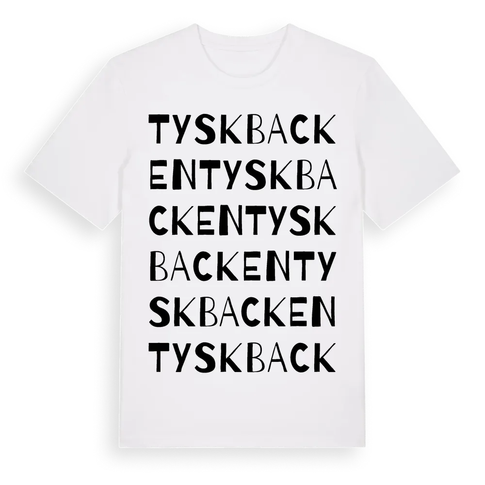 En ordlek byggd på Tyskbackens namn. Subtilt och klurig – ett motiv som bara de som verkligen känner platsen fullt ut förstår. Premium bomull, unisex – från Tyskbacken i Dalarnas län.