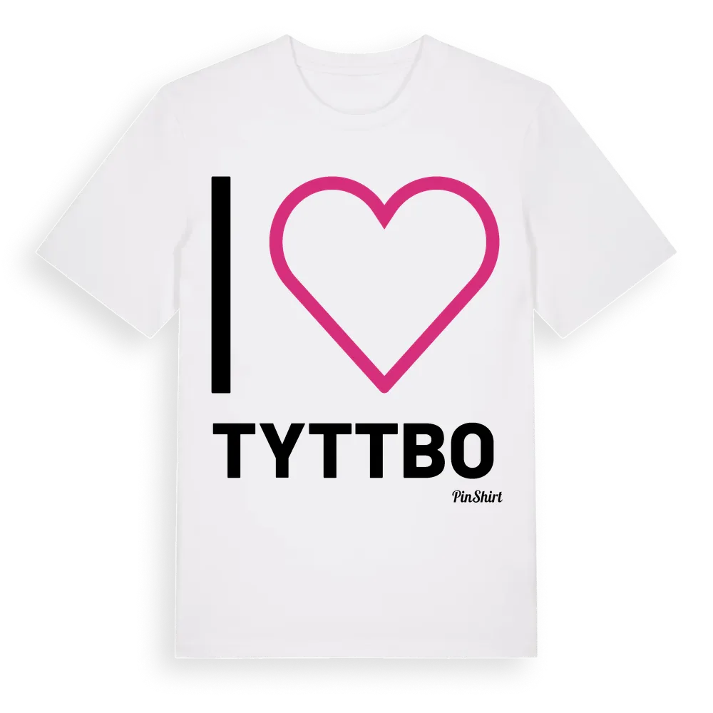 Det klassiska "I ❤ Tyttbo"-motivet i stort format som täcker hela bröstet. För dig som vill visa kärleken till Tyttbo på riktigt. Premium bomull, unisex – från byn Tyttbo i Dalarnas län.