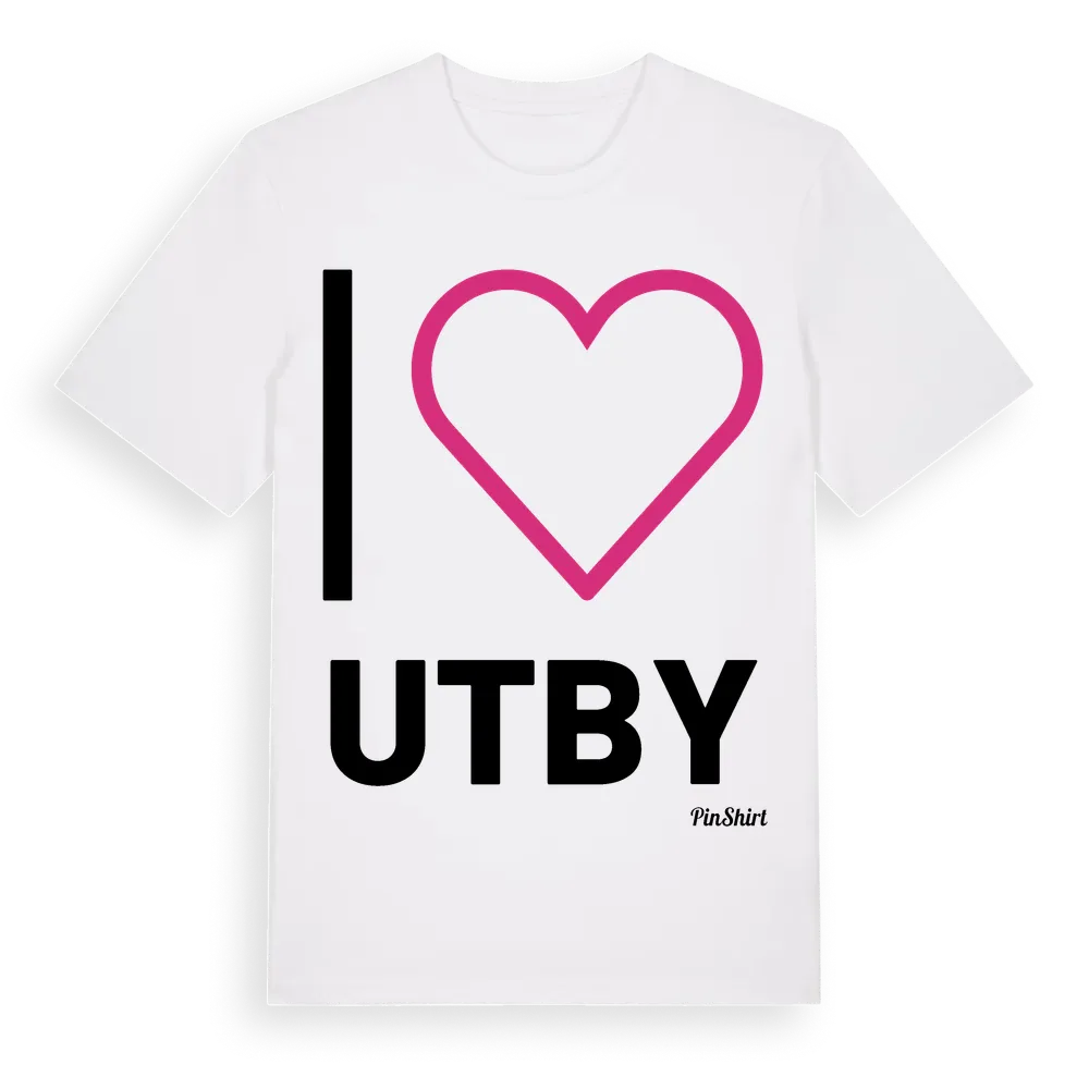 Det klassiska "I ❤ Utby"-motivet i stort format som täcker hela bröstet. För dig som vill visa kärleken till Utby på riktigt. Premium bomull, unisex – från byn Utby i Dalarnas län.