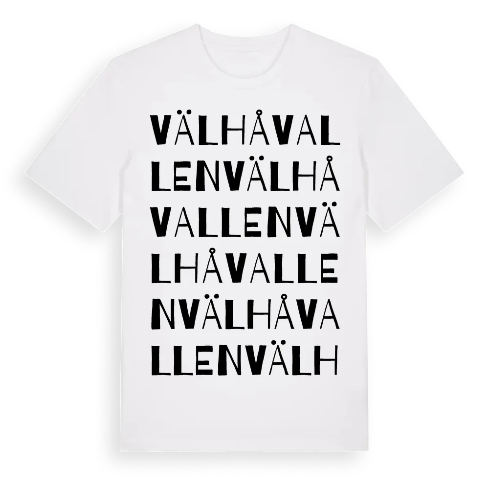 Välhåvallen ordlek t-shirt är inspirerad av byn Välhåvallen i Dalarnas län, Sverige. Tröjan är designad för dig som har en speciell koppling till platsen – oavsett om du bor här, har rötterna här eller bara älskar Välhåvallen.