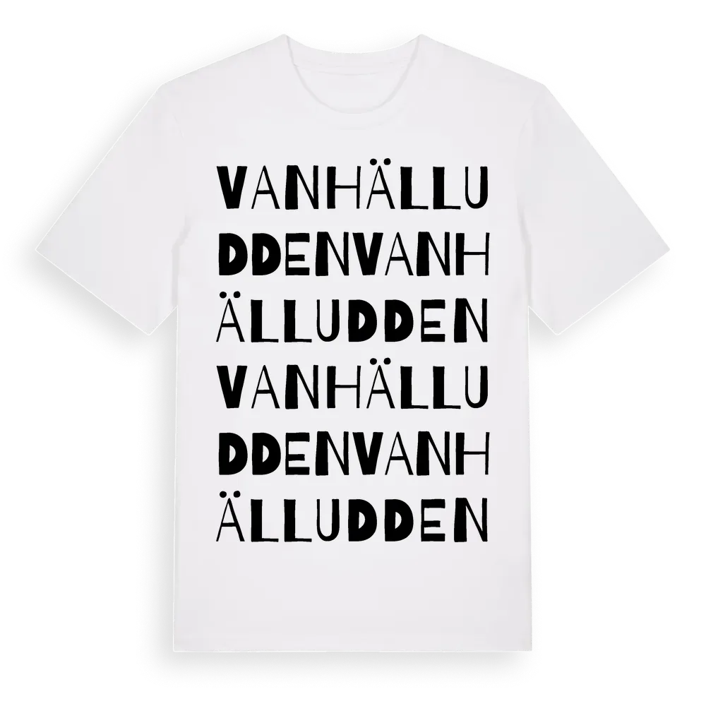 Vanhälludden ordlek t-shirt är inspirerad av Vanhälludden i Dalarnas län, Sverige. Tröjan är designad för dig som har en speciell koppling till platsen – oavsett om du bor här, har rötterna här eller bara älskar Vanhälludden.