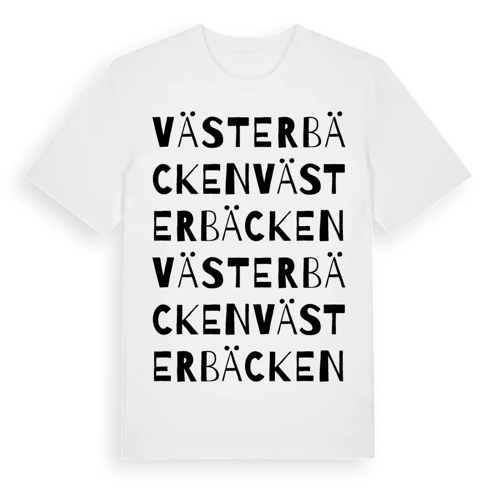 Västerbäcken ordlek t-shirt är inspirerad av byn Västerbäcken i Dalarnas län, Sverige. Tröjan är designad för dig som har en speciell koppling till platsen – oavsett om du bor här, har rötterna här eller bara älskar Västerbäcken.