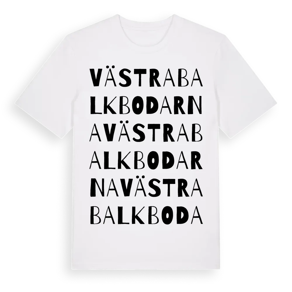 Västra Balkbodarna ordlek t-shirt är inspirerad av Västra Balkbodarna i Dalarnas län, Sverige. Tröjan är designad för dig som har en speciell koppling till platsen – oavsett om du bor här, har rötterna här eller bara älskar Västra Balkbodarna.