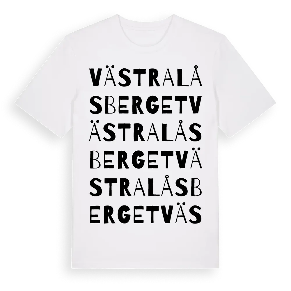Västra Låsberget ordlek t-shirt är inspirerad av Västra Låsberget i Dalarnas län, Sverige. Tröjan är designad för dig som har en speciell koppling till platsen – oavsett om du bor här, har rötterna här eller bara älskar Västra Låsberget.