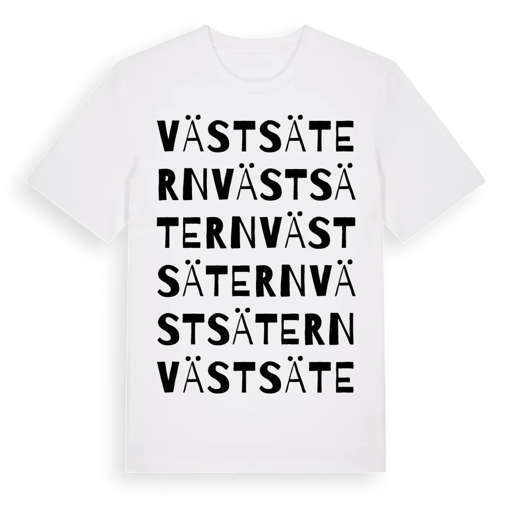 Västsätern ordlek t-shirt är inspirerad av byn Västsätern i Dalarnas län, Sverige. Tröjan är designad för dig som har en speciell koppling till platsen – oavsett om du bor här, har rötterna här eller bara älskar Västsätern.