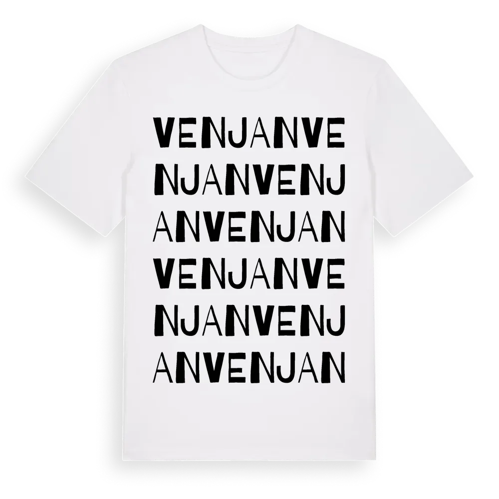 Venjan ordlek t-shirt är inspirerad av byn Venjan i Dalarnas län, Sverige. Tröjan är designad för dig som har en speciell koppling till platsen – oavsett om du bor här, har rötterna här eller bara älskar Venjan.
