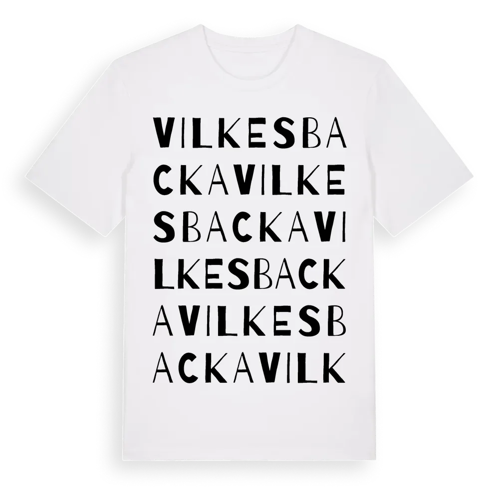 Vilkesbacka ordlek t-shirt är inspirerad av Vilkesbacka i Dalarnas län, Sverige. Tröjan är designad för dig som har en speciell koppling till platsen – oavsett om du bor här, har rötterna här eller bara älskar Vilkesbacka.