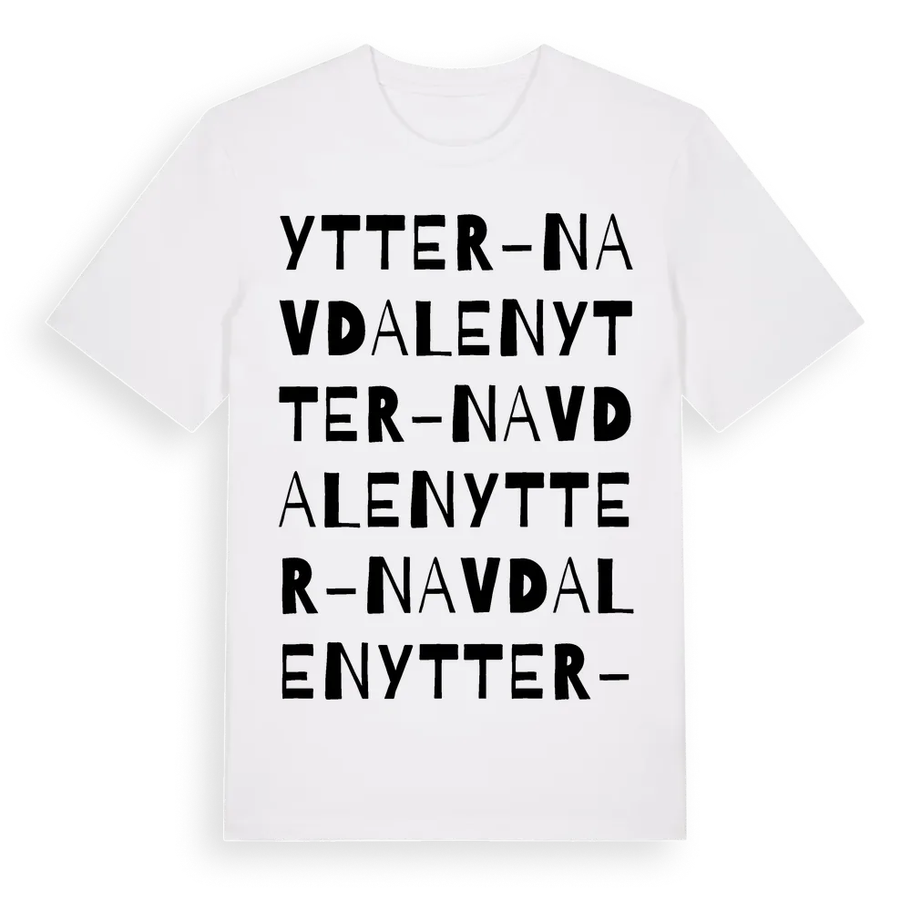 Ytter-Navdalen ordlek t-shirt är inspirerad av Ytter-Navdalen i Dalarnas län, Sverige. Tröjan är designad för dig som har en speciell koppling till platsen – oavsett om du bor här, har rötterna här eller bara älskar Ytter-Navdalen.