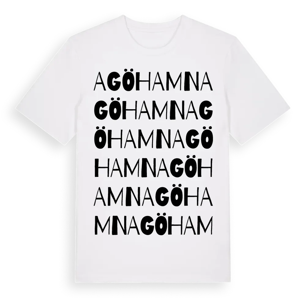 Agö Hamn ordlek t-shirt är inspirerad av byn Agö Hamn i Gävleborgs län, Sverige. Tröjan är designad för dig som har en speciell koppling till platsen – oavsett om du bor här, har rötterna här eller bara älskar Agö Hamn.