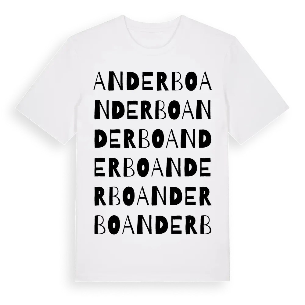 Anderbo ordlek t-shirt är inspirerad av byn Anderbo i Gävleborgs län, Sverige. Tröjan är designad för dig som har en speciell koppling till platsen – oavsett om du bor här, har rötterna här eller bara älskar Anderbo.