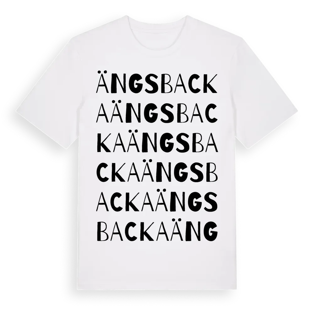 Ängsbacka ordlek t-shirt är inspirerad av Ängsbacka i Gävleborgs län, Sverige. Tröjan är designad för dig som har en speciell koppling till platsen – oavsett om du bor här, har rötterna här eller bara älskar Ängsbacka.