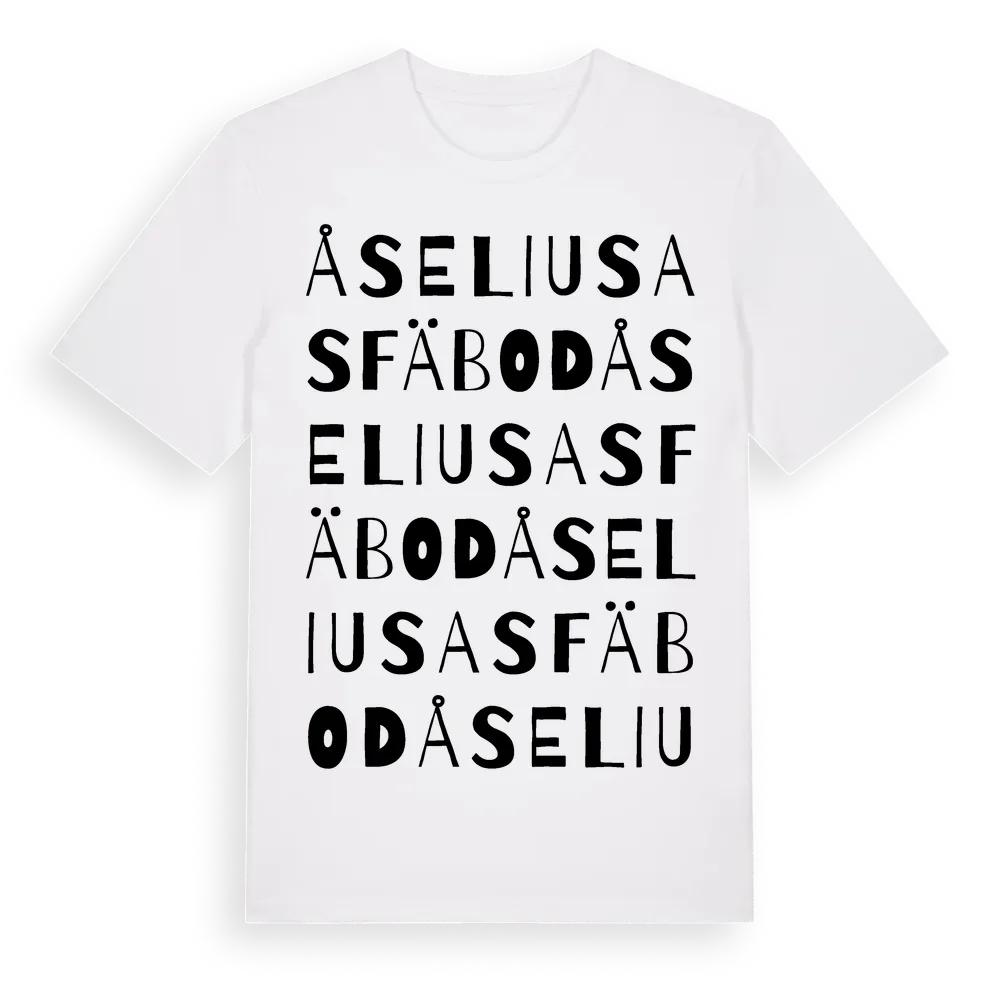 Åseliusas Fäbod ordlek t-shirt är inspirerad av Åseliusas Fäbod i Gävleborgs län, Sverige. Tröjan är designad för dig som har en speciell koppling till platsen – oavsett om du bor här, har rötterna här eller bara älskar Åseliusas Fäbod.