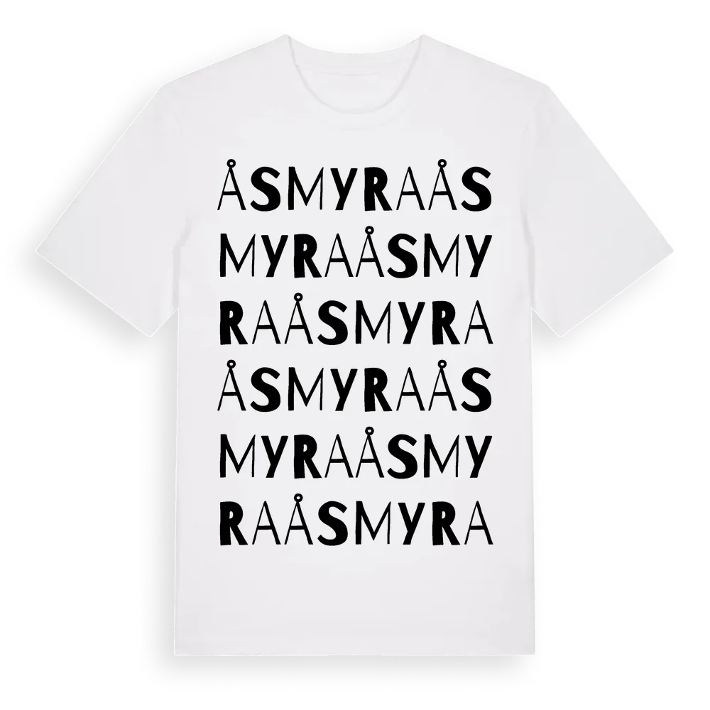 Åsmyra ordlek t-shirt är inspirerad av Åsmyra i Gävleborgs län, Sverige. Tröjan är designad för dig som har en speciell koppling till platsen – oavsett om du bor här, har rötterna här eller bara älskar Åsmyra.