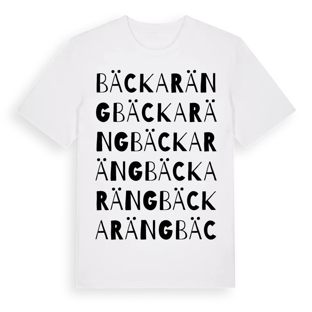 Bäckaräng ordlek t-shirt är inspirerad av byn Bäckaräng i Gävleborgs län, Sverige. Tröjan är designad för dig som har en speciell koppling till platsen – oavsett om du bor här, har rötterna här eller bara älskar Bäckaräng.