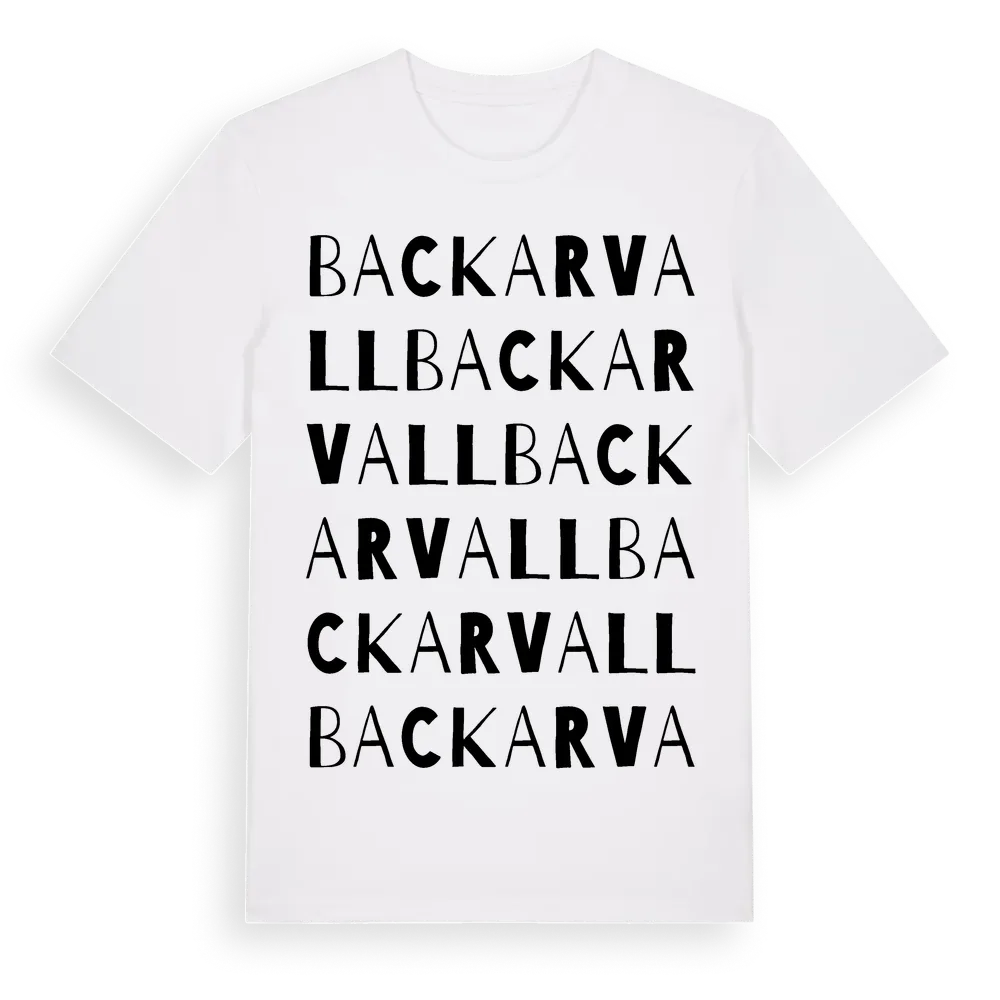 Backarvall ordlek t-shirt är inspirerad av byn Backarvall i Gävleborgs län, Sverige. Tröjan är designad för dig som har en speciell koppling till platsen – oavsett om du bor här, har rötterna här eller bara älskar Backarvall.