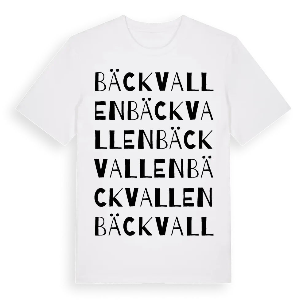 Bäckvallen ordlek t-shirt är inspirerad av byn Bäckvallen i Gävleborgs län, Sverige. Tröjan är designad för dig som har en speciell koppling till platsen – oavsett om du bor här, har rötterna här eller bara älskar Bäckvallen.