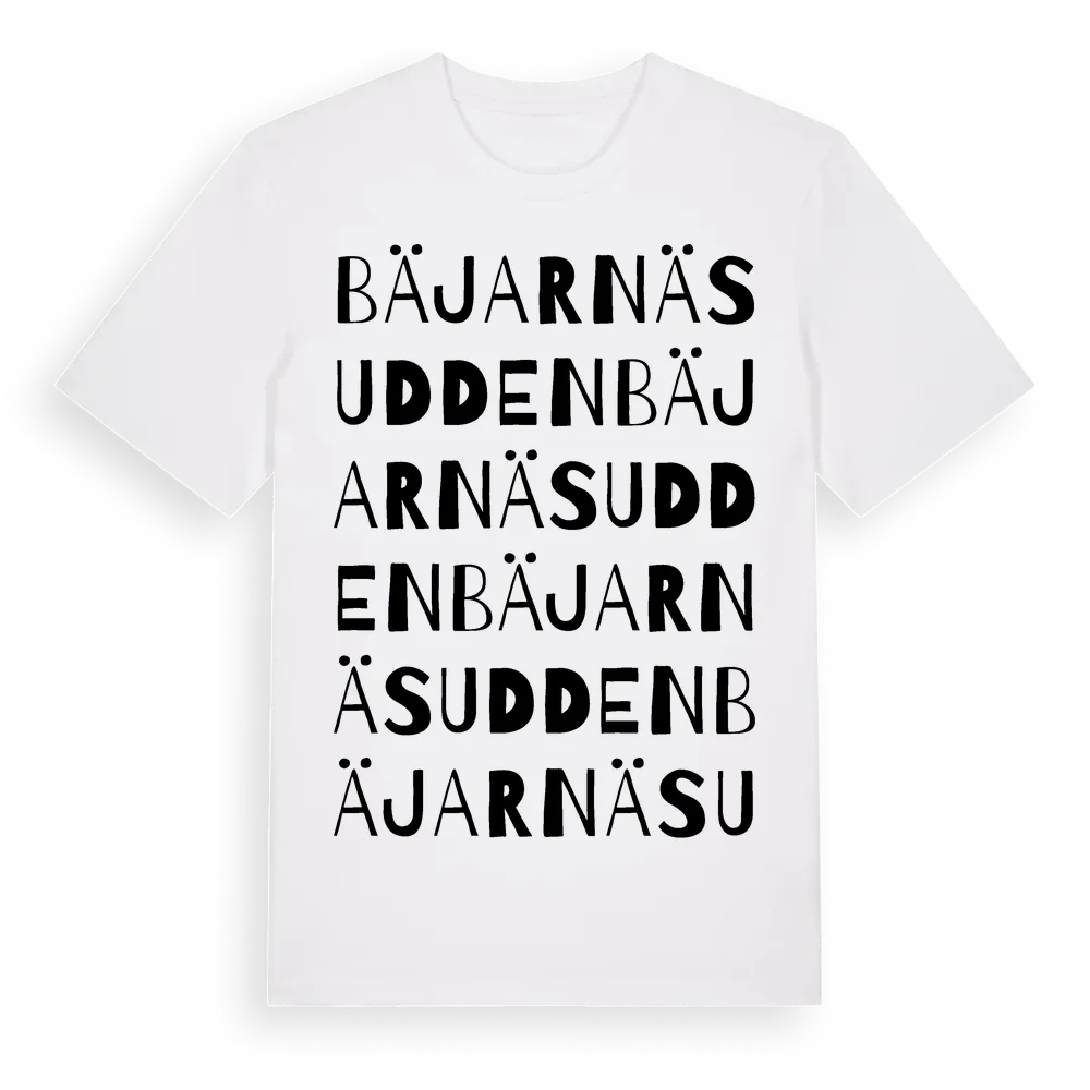 Bäjarnäsudden ordlek t-shirt är inspirerad av Bäjarnäsudden i Gävleborgs län, Sverige. Tröjan är designad för dig som har en speciell koppling till platsen – oavsett om du bor här, har rötterna här eller bara älskar Bäjarnäsudden.