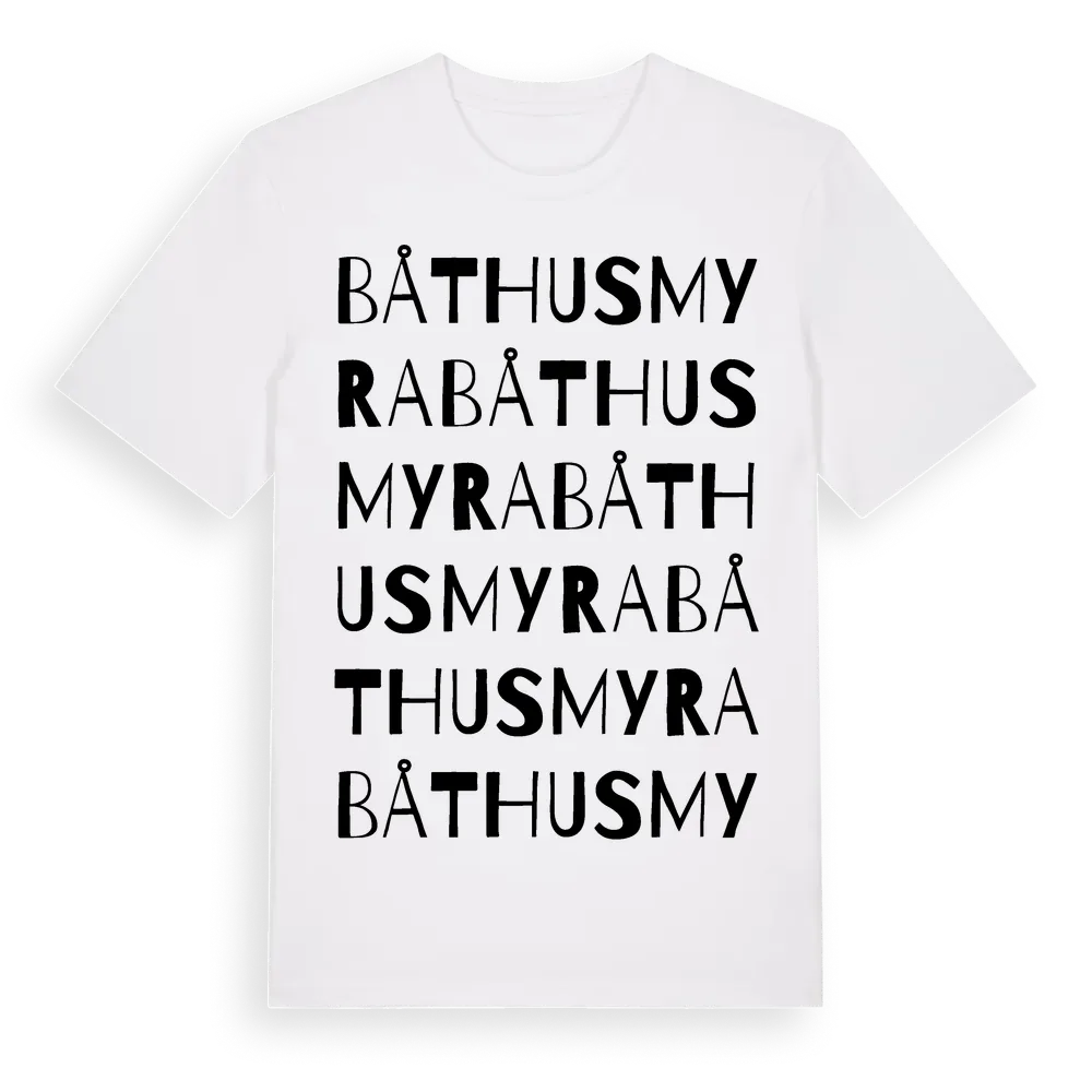 Båthusmyra ordlek t-shirt är inspirerad av byn Båthusmyra i Gävleborgs län, Sverige. Tröjan är designad för dig som har en speciell koppling till platsen – oavsett om du bor här, har rötterna här eller bara älskar Båthusmyra.