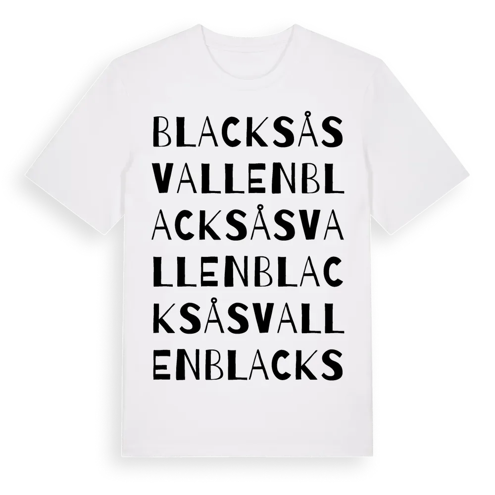 Blacksåsvallen ordlek t-shirt är inspirerad av byn Blacksåsvallen i Gävleborgs län, Sverige. Tröjan är designad för dig som har en speciell koppling till platsen – oavsett om du bor här, har rötterna här eller bara älskar Blacksåsvallen.