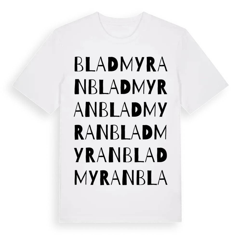 Bladmyran ordlek t-shirt är inspirerad av Bladmyran i Gävleborgs län, Sverige. Tröjan är designad för dig som har en speciell koppling till platsen – oavsett om du bor här, har rötterna här eller bara älskar Bladmyran.