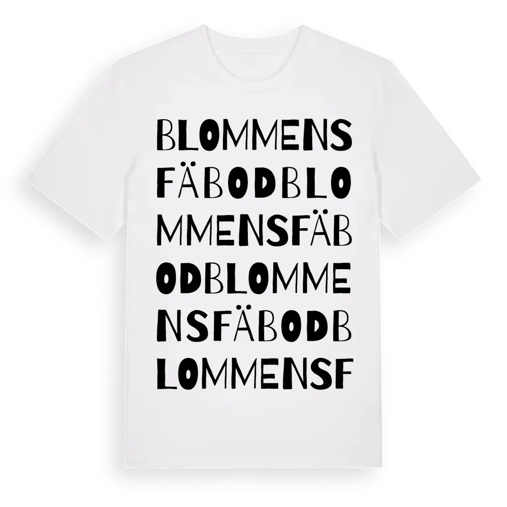 Blommens Fäbod ordlek t-shirt är inspirerad av Blommens Fäbod i Gävleborgs län, Sverige. Tröjan är designad för dig som har en speciell koppling till platsen – oavsett om du bor här, har rötterna här eller bara älskar Blommens Fäbod.