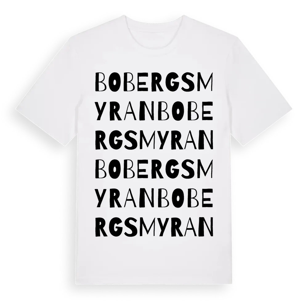 Bobergsmyran ordlek t-shirt är inspirerad av byn Bobergsmyran i Gävleborgs län, Sverige. Tröjan är designad för dig som har en speciell koppling till platsen – oavsett om du bor här, har rötterna här eller bara älskar Bobergsmyran.