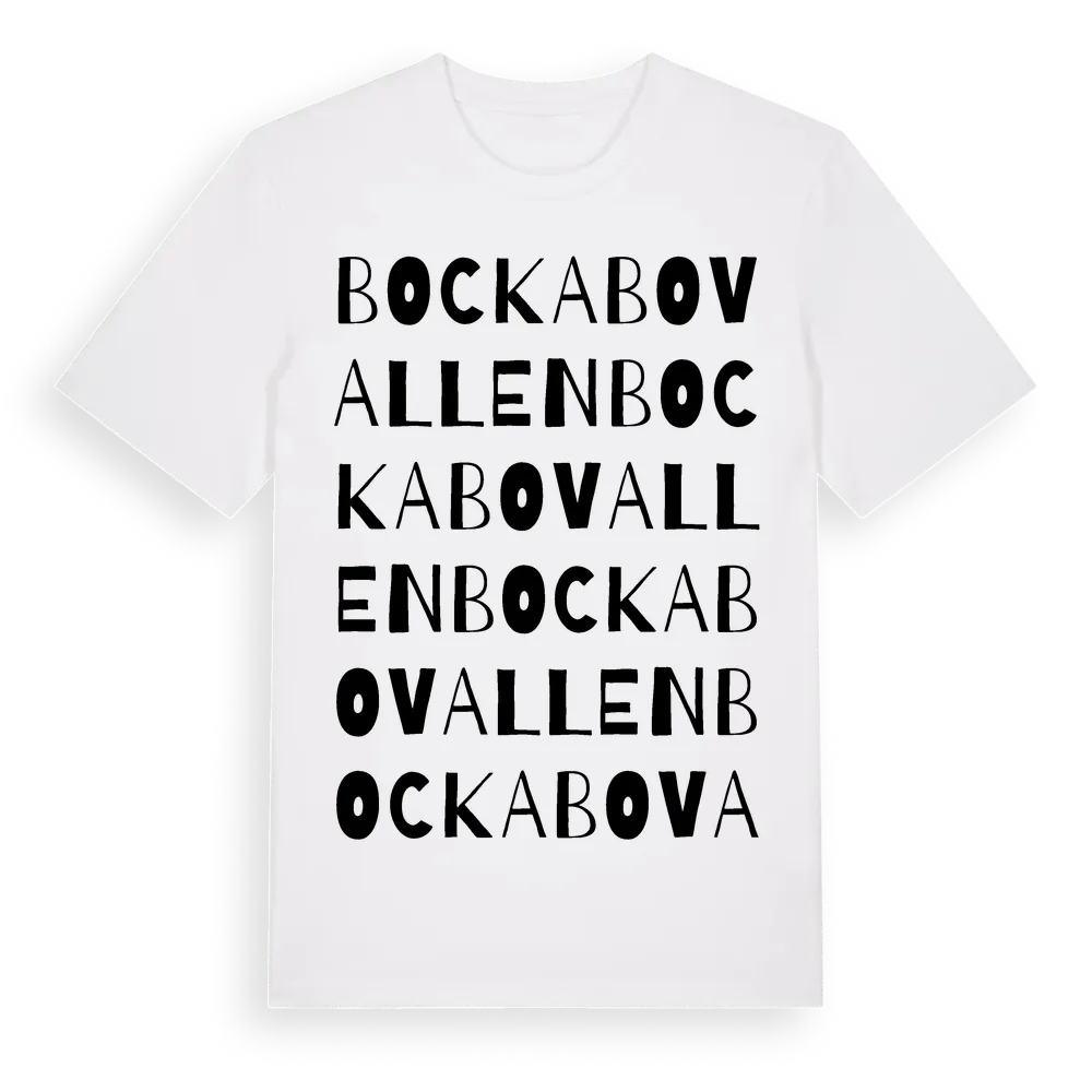 Bockabovallen ordlek t-shirt är inspirerad av Bockabovallen i Gävleborgs län, Sverige. Tröjan är designad för dig som har en speciell koppling till platsen – oavsett om du bor här, har rötterna här eller bara älskar Bockabovallen.