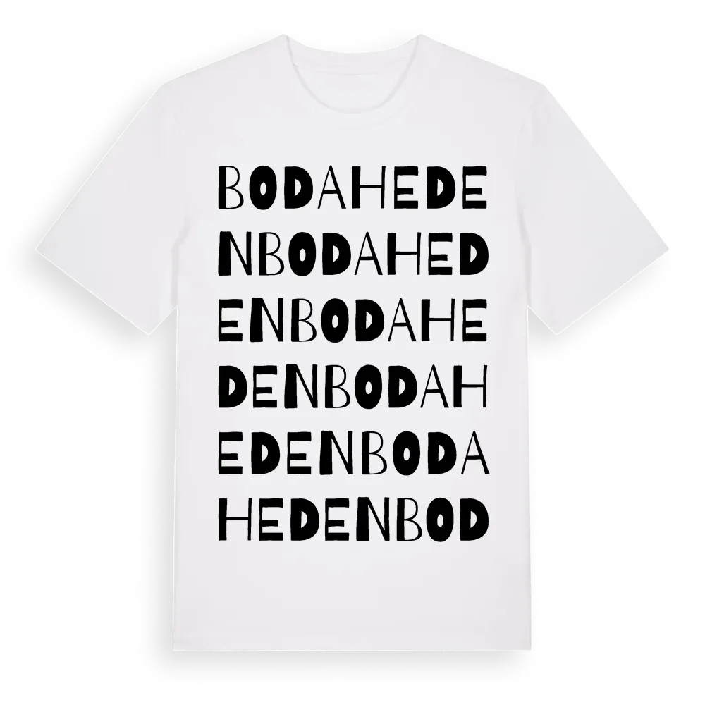 Bodaheden ordlek t-shirt är inspirerad av byn Bodaheden i Gävleborgs län, Sverige. Tröjan är designad för dig som har en speciell koppling till platsen – oavsett om du bor här, har rötterna här eller bara älskar Bodaheden.