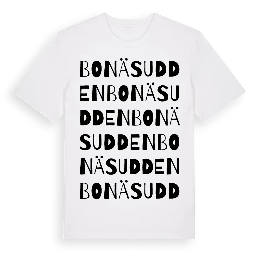 Bonäsudden ordlek t-shirt är inspirerad av Bonäsudden i Gävleborgs län, Sverige. Tröjan är designad för dig som har en speciell koppling till platsen – oavsett om du bor här, har rötterna här eller bara älskar Bonäsudden.