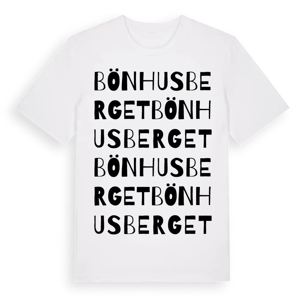 Bönhusberget ordlek t-shirt är inspirerad av stadsdelen Bönhusberget i Gävleborgs län, Sverige. Tröjan är designad för dig som har en speciell koppling till platsen – oavsett om du bor här, har rötterna här eller bara älskar Bönhusberget.