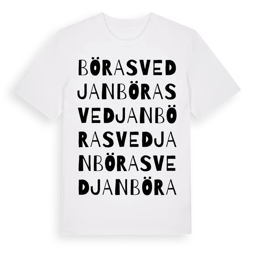 Börasvedjan ordlek t-shirt är inspirerad av Börasvedjan i Gävleborgs län, Sverige. Tröjan är designad för dig som har en speciell koppling till platsen – oavsett om du bor här, har rötterna här eller bara älskar Börasvedjan.