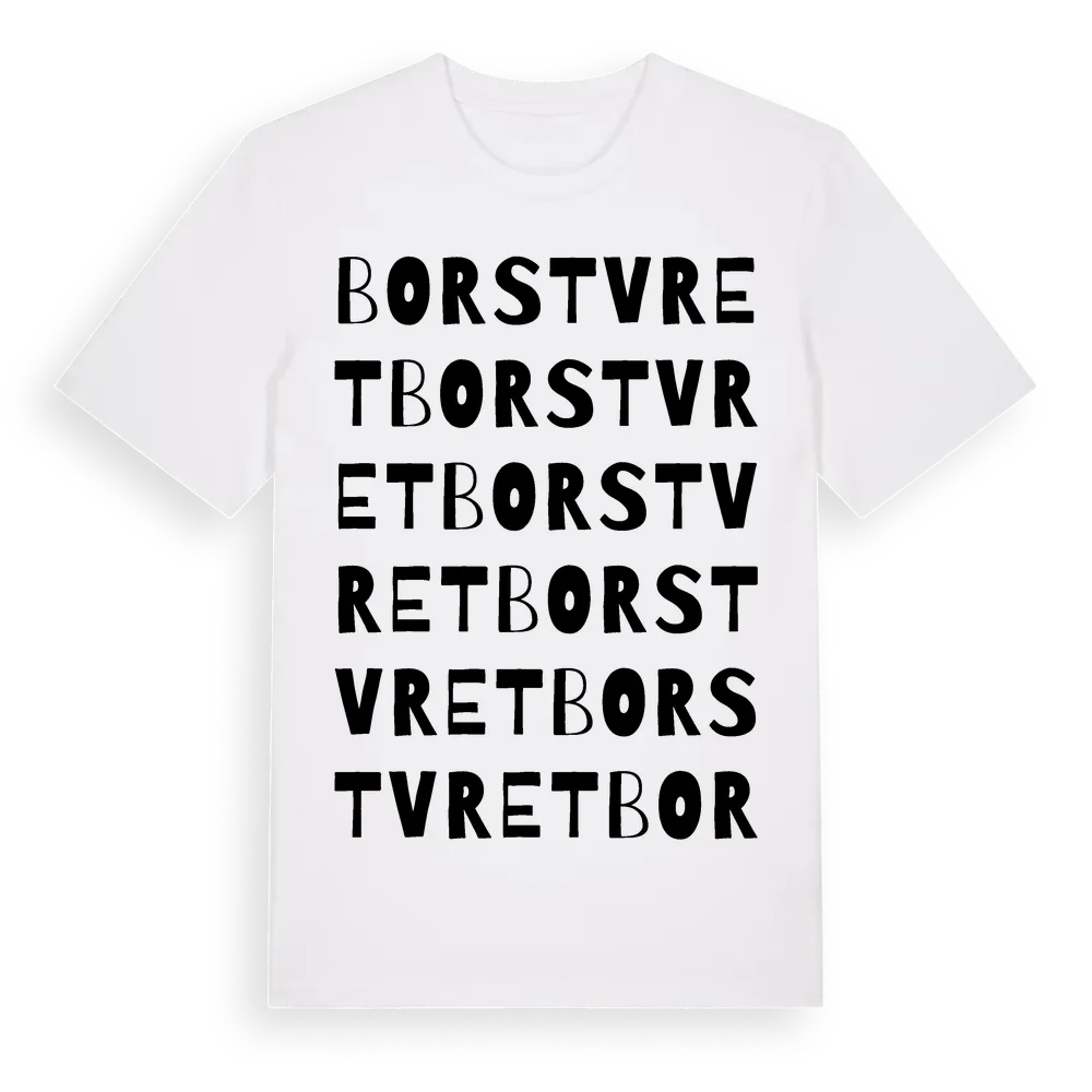 Borstvret ordlek t-shirt är inspirerad av Borstvret i Gävleborgs län, Sverige. Tröjan är designad för dig som har en speciell koppling till platsen – oavsett om du bor här, har rötterna här eller bara älskar Borstvret.