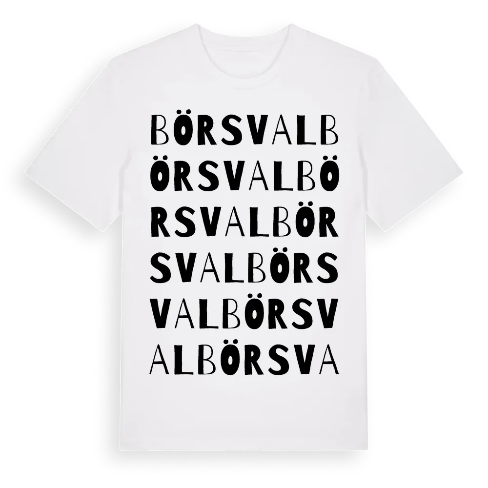 Börsval ordlek t-shirt är inspirerad av byn Börsval i Gävleborgs län, Sverige. Tröjan är designad för dig som har en speciell koppling till platsen – oavsett om du bor här, har rötterna här eller bara älskar Börsval.