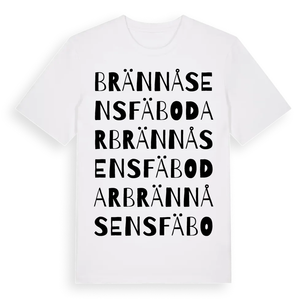 Brännåsens Fäbodar ordlek t-shirt är inspirerad av Brännåsens Fäbodar i Gävleborgs län, Sverige. Tröjan är designad för dig som har en speciell koppling till platsen – oavsett om du bor här, har rötterna här eller bara älskar Brännåsens Fäbodar.