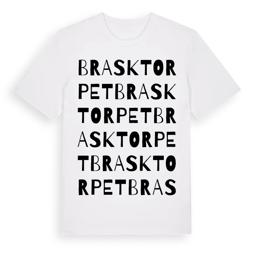 Brasktorpet ordlek t-shirt är inspirerad av Brasktorpet i Gävleborgs län, Sverige. Tröjan är designad för dig som har en speciell koppling till platsen – oavsett om du bor här, har rötterna här eller bara älskar Brasktorpet.