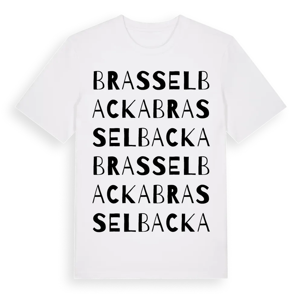 Brasselbacka ordlek t-shirt är inspirerad av Brasselbacka i Gävleborgs län, Sverige. Tröjan är designad för dig som har en speciell koppling till platsen – oavsett om du bor här, har rötterna här eller bara älskar Brasselbacka.